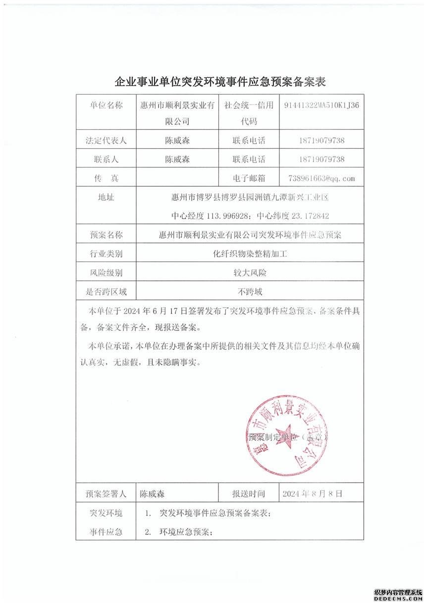已制訂《惠州市順利景實業(yè)有限公司環(huán)境風(fēng)險評估報告》,并于2024年8月9日上報博羅縣環(huán)境保護局備案; |