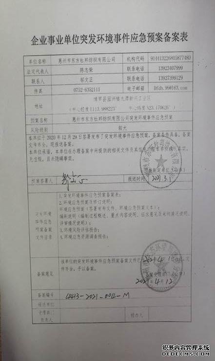 已制訂《惠州市東方杜邦紡織有限公司突發(fā)環(huán)境事件應急預案》,并于2021年 4月12日在博羅縣環(huán)境保護局備案,備案編號:4413-2021-004-M |
