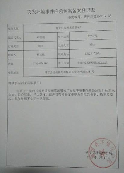 附件鏈接:《博羅縣園洲萊諾服裝廠突發(fā)環(huán)境事件應急預案備案登記表》